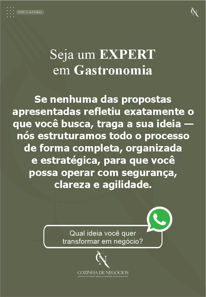 O Expert em Gastronomia tem como função entregar negócios gastronômicos completos e prontos para implantação, reduzindo o tempo de desenvolvimento, o risco de erro estratégico e o custo do improviso.